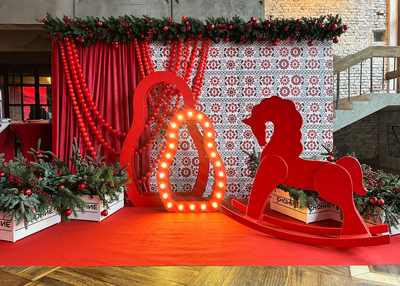 Центральными элементами этой волшебной композиции выступают две большие матрёшки, которые создают объем и задают тон всей фотозоне. Рядом с ними расположился большой деревянный конь-качалка — любимец не только детей, но и взрослых, дарящий нотку ностальгии и беззаботного счастья.